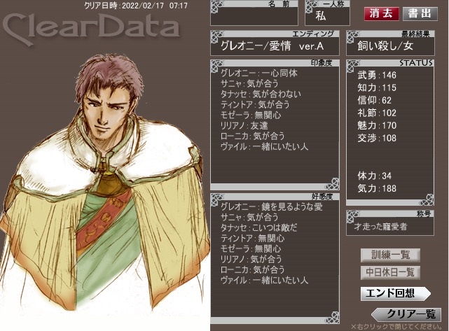 そんで最終日をやり直してヴァイル友情Bを見たら、レハトが城に残ることをめちゃくちゃ喜んでてさらにダメージを受けたっていう…