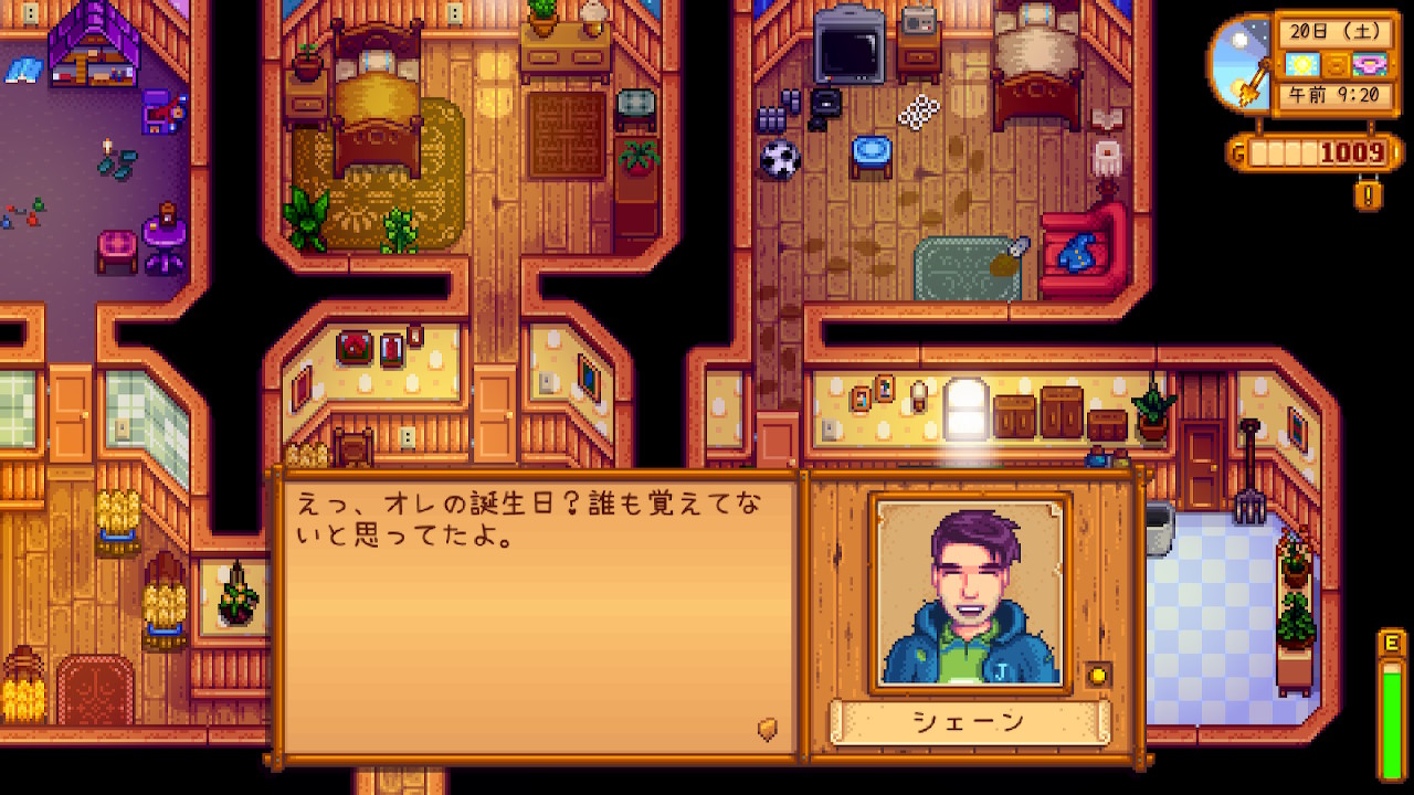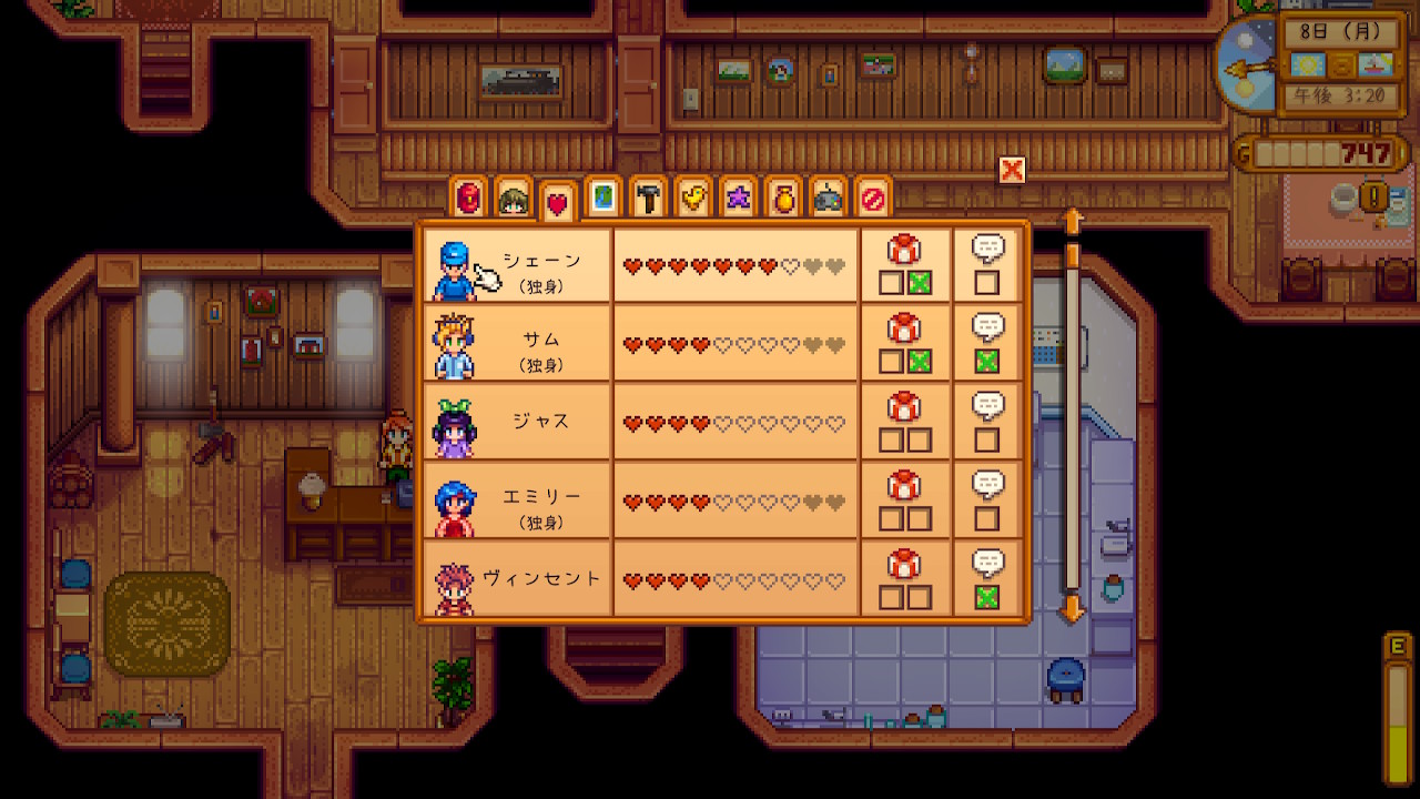 過去のプレイデータの中で唯一結婚したことあるのがシェーンなので今回はシェーン以外と結婚しよう…と思ってたんだけど、やっぱり過去データで唯一の結婚相手に選んだキャラなので毎日酒場に通ってしまい…コツコツ好感度を上げ…。
